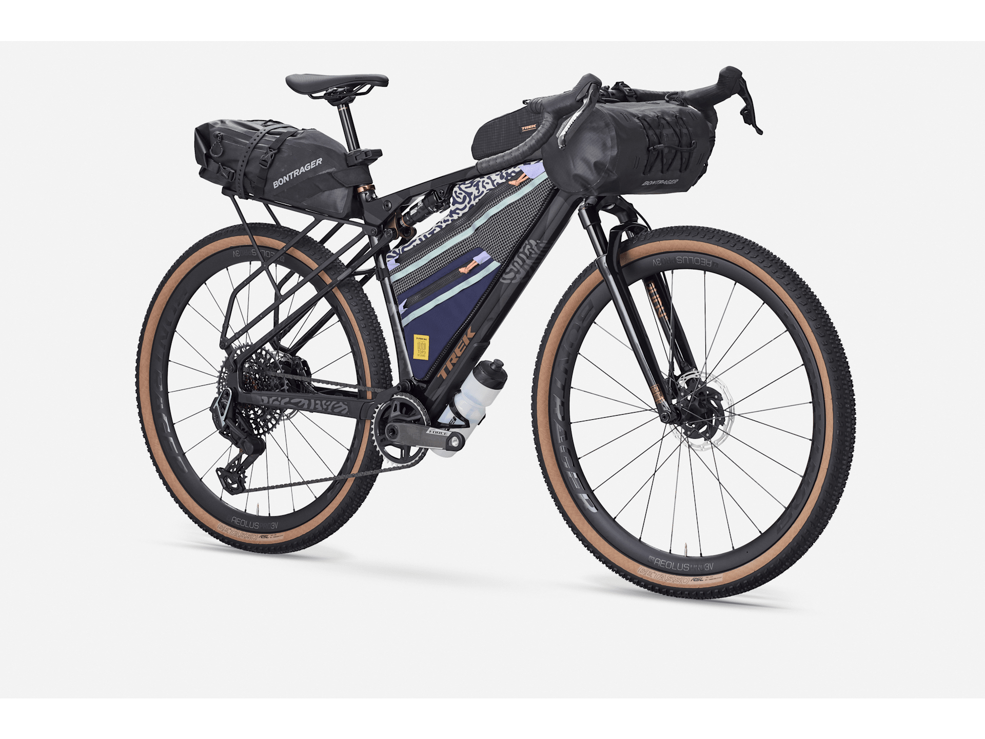 For bikepacking, Trek offers 18 mounting points on the frame—plenty for carrying gear. Notable are the two adjustable Wolf Tooth-style mounts on the down tube and the integrated rear rack, which sits on its own pivots to accommodate frame suspension.